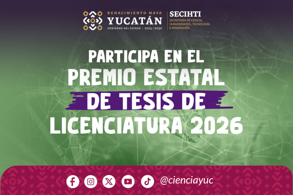 Con el objetivo de impulsar, motivar e incentivar a los estudiantes de nivel superior a generar trabajos de investigación que les ayude a desarrollar habilidades científicas mediante la elaboración de trabajos de tesis, la Secretaría de Ciencia, Humanidades, Tecnología e Innovación, a través de la Subsecretaría de Tecnología e Innovación, emiten la presente convocatoria para participar en el Premio Estatal de Tesis Yucatán Nivel Licenciatura 2026