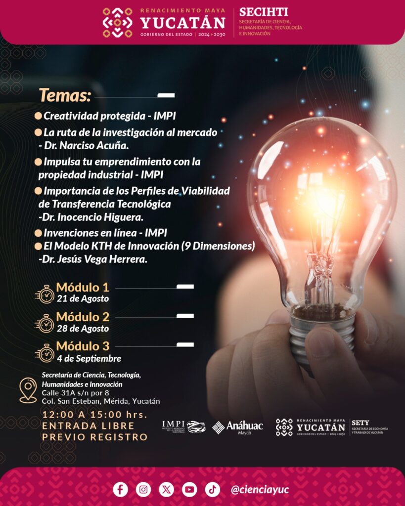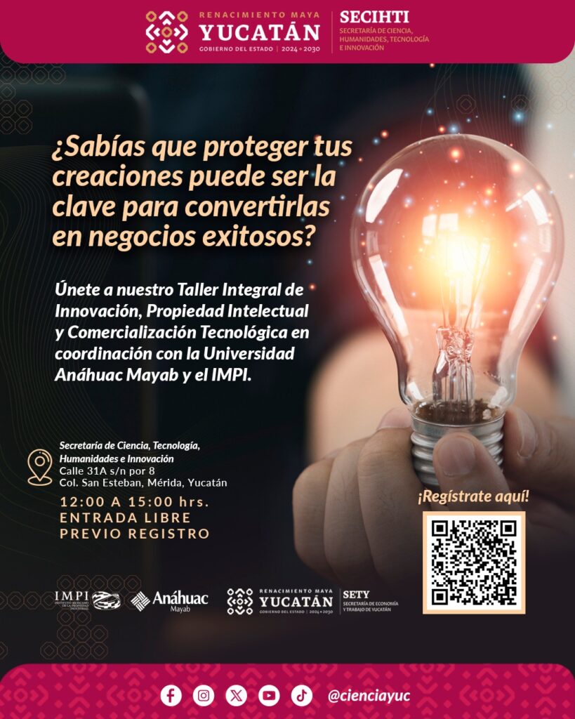 Únete al Taller Integral de Innovación, Propiedad Intelectual y Comercialización Tecnológica en coordinación con el Instituto Mexicano de la Propiedad Industrial y la Universidad Anáhuac Mayab y descubre cómo: