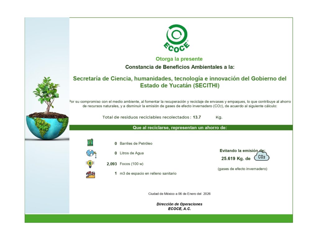 La Secretaría de Ciencia, Humanidades, Tecnología e Innovación (Secihti) recibió la Constancia Ambiental 2025 como reconocimiento a su participación y compromiso con acciones de responsabilidad ambiental, reafirmando su contribución al cuidado del entorno y al desarrollo sostenible.